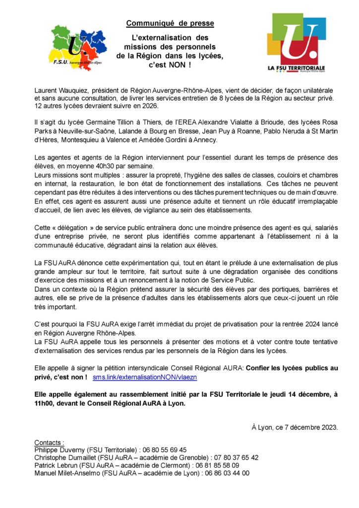 Communiqué de presse : L’externalisation des missions des personnels de la Région dans les lycées, c’est NON !