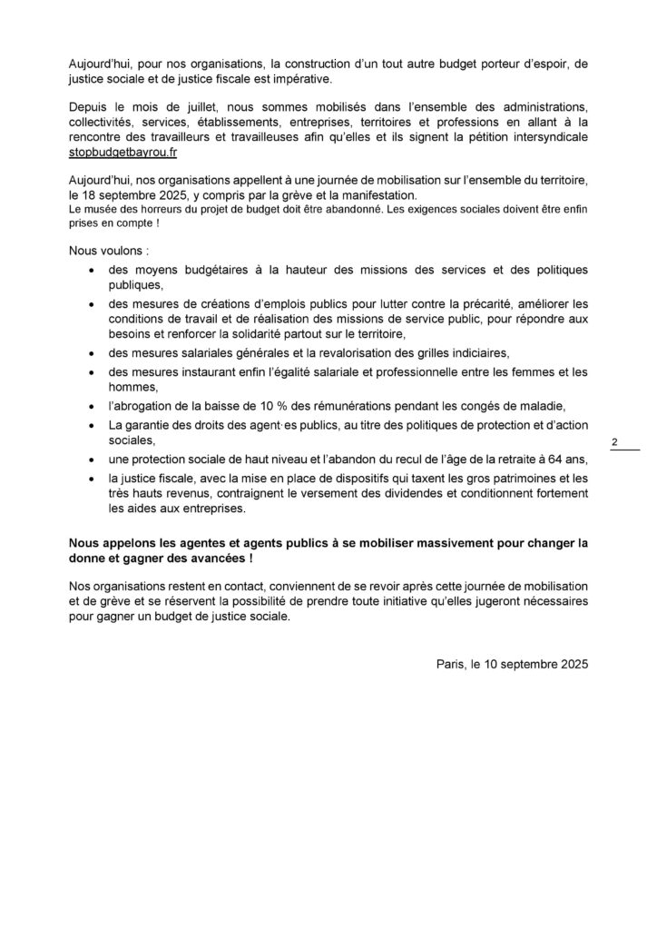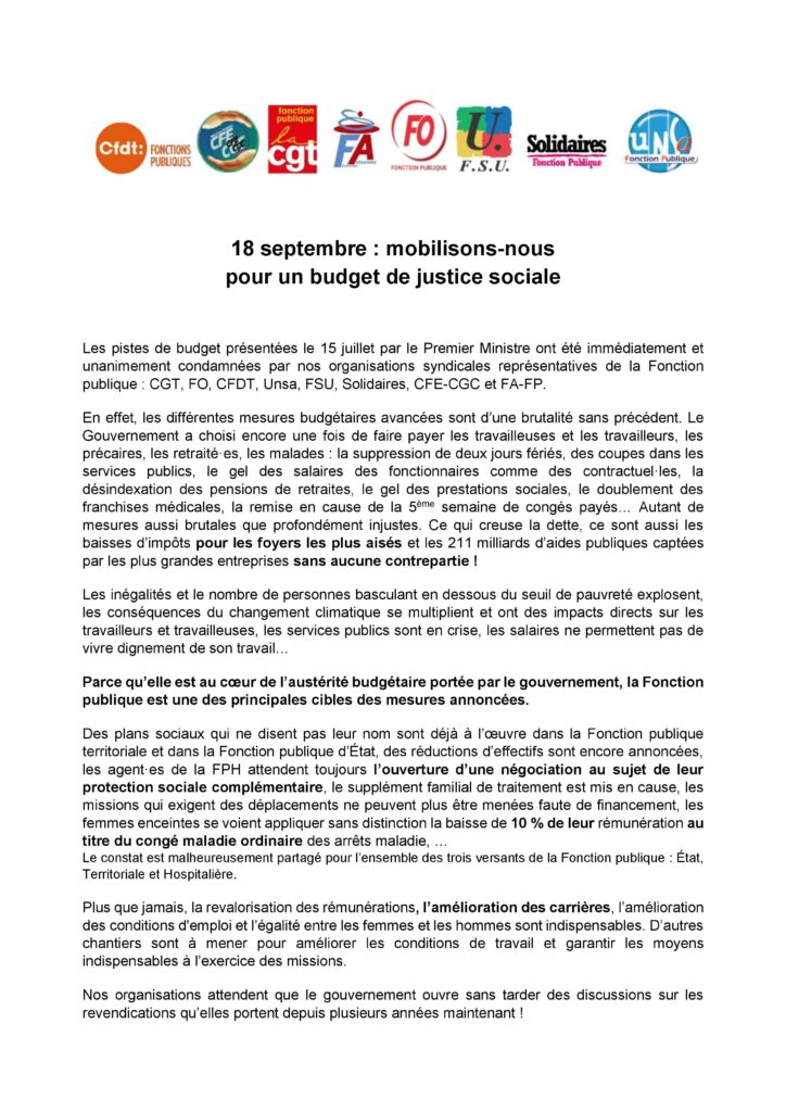 Ce cadre budgétaire est insoutenable de l’aveu même du Premier ministre qui va solliciter le 8 septembre un vote de confiance auprès des députés. Mais quel que soit le résultat de ce vote, pour avoir une chance de peser sur les politiques à l’œuvre ou à venir le monde du travail, et en particulier les agent·e·s de la fonction publique territoriale, doivent faire entendre leur voix.